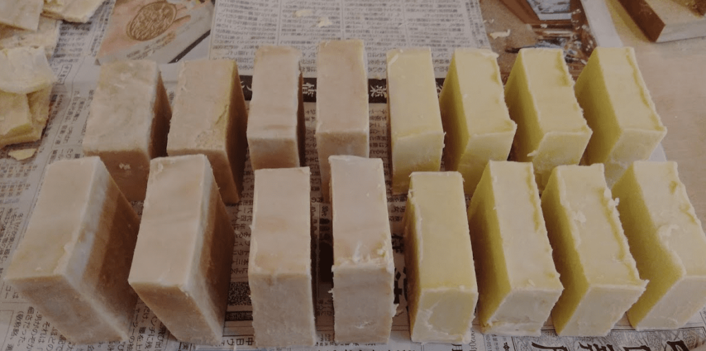 ただし、6週間ぐらい乾燥させれば使用できるようになりますが、出来たては、泡立ちはやや悪く、若干溶けやすいです。作ってから3ヶ月~6ヶ月たつと泡立ちはグっと豊かになり、溶けにくくなっていきます。