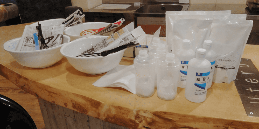 また、石けん作りの最中は、石けん素材が服に跳ねたりすることもございますので、大切なお召し物の場合は割烹着などの袖のあるもの、あるいは、長めのゴム手袋などを利用し、ご自身でケアをお願いいたします。もし不安であれば、汚れてもいいトレーナーなどの着替えをお持ちください。